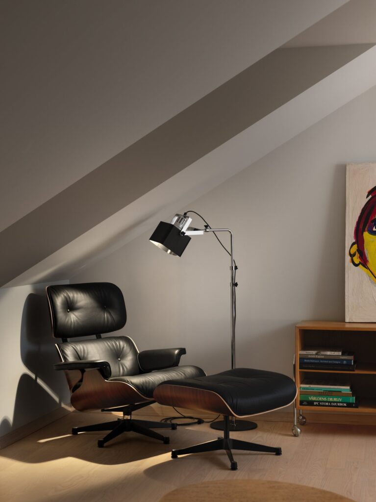 Niin sanottu arkkitehtivalaisin, 100F, on valmistettu alumiinista, teräsputkesta ja lasikuidusta. Lattiavalaisimen minimalistinen rakenne on suunniteltu heijastamaan epäsuoraa valoa. Materiaalit on valittu huolellisesti kestävyyden ja yksinkertaisuuden ehdoilla. Ylöspäin suuntautuva valo kohottaa tilan tunnelmaa säilyttäen hillityn, arkkitehtonisen muodon.
