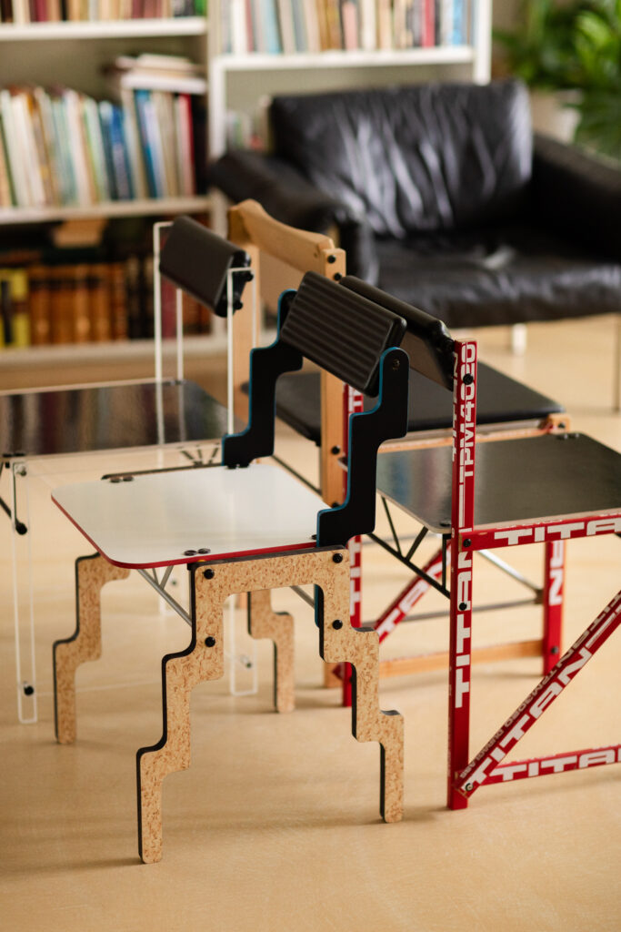 The Nelonen chairs are unrestricted in their use of materials: aluminium, plexiglass, plywood, solid wood, laminate and even ice hockey sticks were all suitable raw materials. Eventually, the chair also evolved into a walking aid, a Nelonen fitted with wheels, which served Kukkapuro in his final years.